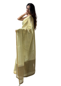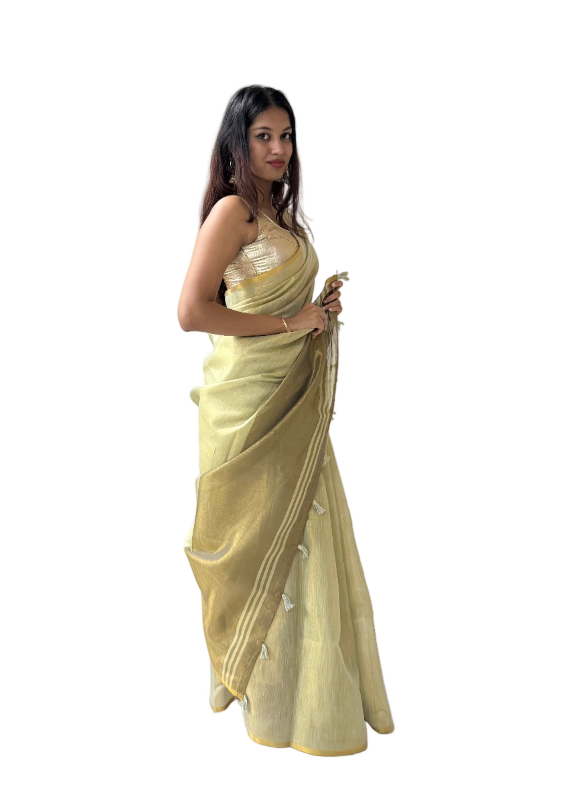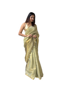 Elevate your elegance with this Cream Gold Plain Tissue Saree, a celebration of minimalism and refined beauty. Woven with a soft golden shimmer over a subtle cream base, this saree exudes understated luxury. The minimal narrow border adds a graceful frame without distracting from its timeless simplicity.